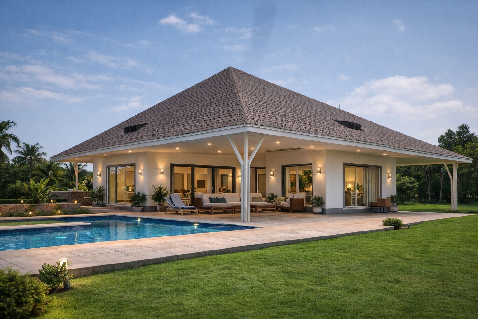 A farmhouse is a countryside home designed to blend comfort with nature, often featuring open spaces, natural materials, and wide verandas.